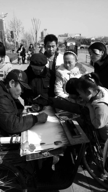 到了周末午后天气暖和,游人聚集,大小便失禁的赵建国不敢多吃一口饭,多喝一口水,他带上工具,开着自己的手摇三轮车,一个小时后赶到东昌湖边。停好车子,用几根布条把两个木条分别绑在三轮车的车帮上,架上两个木板,用两个铁夹子把画纸铺平,赵建国的画摊才能正式开始营业。