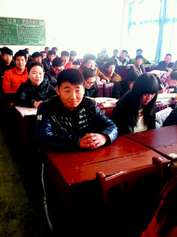 金明柱(前排左一)在教室内准备上课。