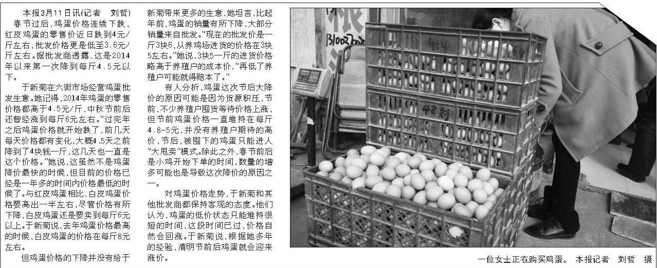 但鸡蛋价格的下降并没有给于新菊带来更多的生意,她坦言,比起年前,鸡蛋的销量有所下降,大部分销量来自批发。“现在的批发价是一斤3块6,从养鸡场进货的价格在3块5左右。”她说,3块5一斤的进货价格略高于养殖户的成本价,“再低了养殖户可能就得赔本了。”