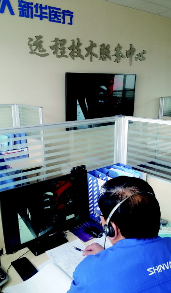 ▲新华医疗工作人员正通过远程技术解答客户问题。