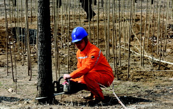 供电部门工作人员清除电力线路保护区内违章种植树木。 通讯员 崔磊 摄