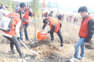 11日,由共青团枣庄市委组织的2015年植树节活动在薛城佛光山生态园展开。一上午的时间,来自枣庄市各局工作人员及志愿者们为本是光秃的山坡增添了一抹靓丽的绿色。参加活动的人员不仅感受到自己为城市添绿的喜悦,也希望一棵棵树苗能够茁壮成长。 本报记者 孙越 摄影报道