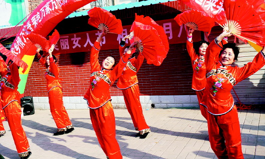 3月7日,甸北社区歌舞队跳起了欢快的广场舞,庆祝三八妇女节。