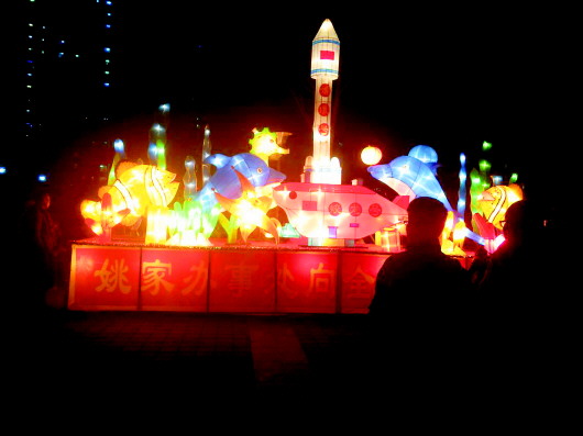 记者游走在花灯会场,各类灯饰让人眼花缭乱,花灯造型也是形态各异,让人眼前一亮。“羊”的卡通造型、中国传统财神爷、鲤鱼跳龙门等经典吉祥元素、还有“蛟龙号”“嫦娥号”,结合简单鲜明的“打造济南新浦东”、“恭喜发财”、“百财聚来”等花灯标语,让人目不暇接。