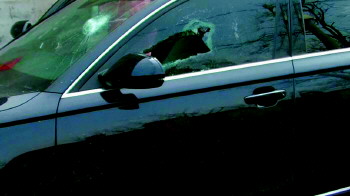 奥迪车的前挡风玻璃和车窗被砍碎。