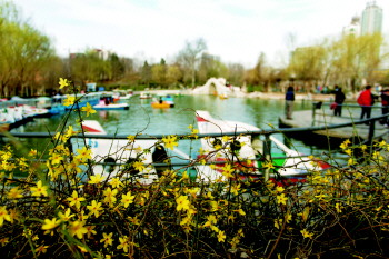 12日,张店人民公园内的迎春花竞相开放,市民在公园内悠闲地欣赏美好的春景。12日是“九九”的最后一天,最近几日淄博的气温也在不断回升,据气象部门预报,下周一最高温将达到23℃,与去年同期相比高出1—3℃。