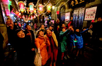 游客正在周村古商城内看花灯(资料片)。 本报通讯员 张红霞 摄