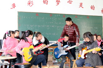 在峄城区阴平镇传开希望小学,学校里唯一的音乐老师刘延辉组建了一个由12名小学生组成的名为凤凰星的电声乐队。同时,刘延辉老师利用假期和课余时间为爱好音乐的学生义务上课,让农村小学生也能触摸到电声乐器,感受到音乐带来的乐趣。图中,刘老师正在指导学生们进行练习。 本报记者 杨霄 本报通讯员 孙磊 摄影报道