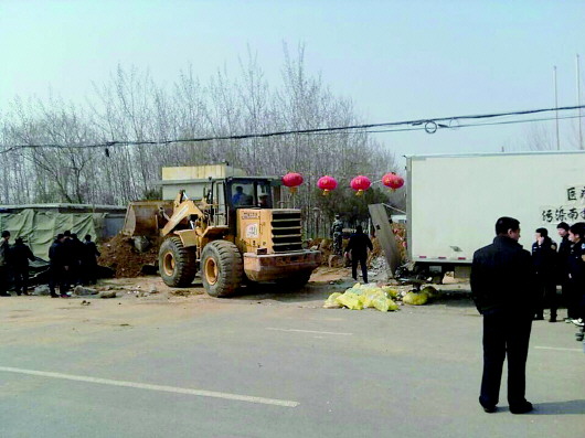 在近300名警力的协助下,街道办等有关部门用挖土机将瀚洋公司门口的土石挖开。村民供图