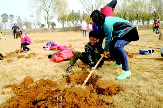 15日上午,山师附小2014级7班的30名孩子在家长陪伴下,来到济南市园博园景区植树。以实际行动践行了“播种绿色,奉献爱心,远离雾霾,从我做起”的誓言。 本报记者 戴伟 摄
