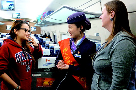 ◤青岛客运段列车长服务外籍旅客。