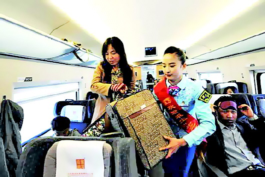 “老人属于我们的重点特殊旅客,我们必须照顾好。”列车长林芝说,像老人这种重点旅客每趟车都会遇到,照顾好他们是她的职责所在。除了要照顾重点旅客外,每次巡视车厢,林芝和乘务员还要查票、整理旅客的行李,以及打扫车厢卫生,客流量大的时候根本忙不过来。“因为高铁速度快,我们经常还没巡视完车厢,车就到站了。”林芝说,她们的工作节奏非常快,根本不是人们印象中只是外表光鲜亮丽。