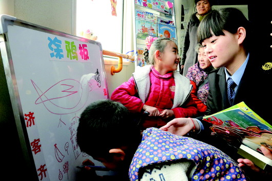 在“小候鸟栖息地”,列车员在闲暇时来照顾陪伴孩子。