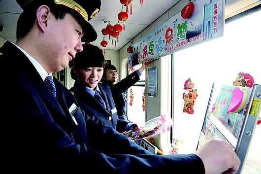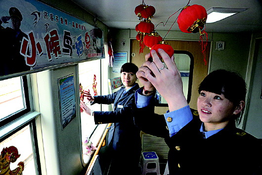 乘务员对“小候鸟栖息地”进行装饰。