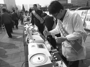 在高新区谷德广场投诉点,一处快检服务监测点也同样地吸引了不少市民的围观。一套完整的农残兽残检测设备放在台上,一名工作人员正在进行白菜叶的检测,“抑制率不到10%,这说明白菜合格,农药残留没有超标。”工作人员说。