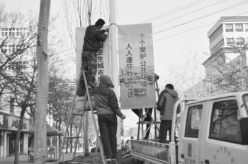 近日,德城区城管局将新湖南大街的道旗广告更换为国家卫生城市复审公益广告。