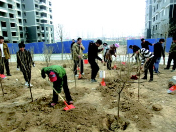 滨河新城经适房小区 新增700余棵树苗 15日上午,菏泽市住房保障与房产管理局全体工作人员来到滨河新城经适房小区,为小区种下绿化树。据了解,树苗共700余棵,包括梨树、杏树、桃树、木瓜树、樱花树等八个树种,分布在小区各个绿化带。 本报记者 陈晨 摄影报道