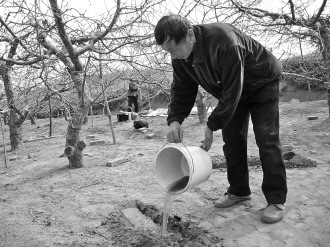 ◥图为李水正在对果树进行施肥。  记者 李孟霏 摄