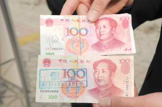 3.15当天,经银行工作人员讲解记者了解到,市场上所使用的验钞机一般只能检验出钞票有水印部分的真假,水印部分为真则很容易把“验钞机”糊弄过去。两张假的百元大钞你能看出假在哪吗? 本报记者 韩微 摄影报道