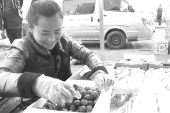 16日,华茂街一家水果店前,女老板正在整理刚到的大樱桃。这些樱桃都是来自大连,售价60-150元/斤不等。 本报记者 吕奇 摄