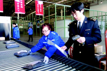 流亭机场海关关员在扫描快递包裹条形码。