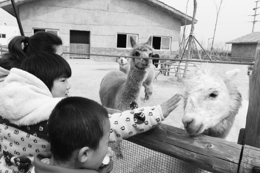 孩子们在跟羊驼打招呼。