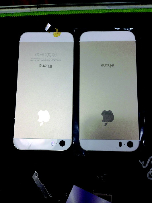 ◥在华强北的通天地通讯市场内,仿制的手机后壳(右)和贴有黄色小标的旧货手机后壳(左),从外观上都很难跟新机区分。