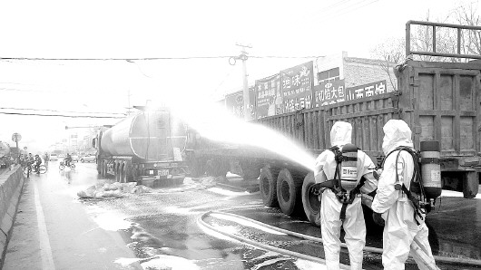 17日早上6点多,在东昌府区沙镇中心街,两辆车在十字路口发生撞击,导致一辆载有30吨汽油的槽罐车发生泄漏,由于事故现场位于闹市区,人口密集,一旦引起火灾,将造成巨大次生灾害的发生。6点38分,聊城市公安消防支队接警后,立即调集2个消防中队和战勤保障大队、8台消防车、40余名消防指战员赴现场处置。同时,消防支队启动化学危险品运输车辆事故处置预案,市政府应急办启动应急联动预案,公安、安监、交通、供电、镇政府等相关联动单位、部门赶赴现场配合处置。