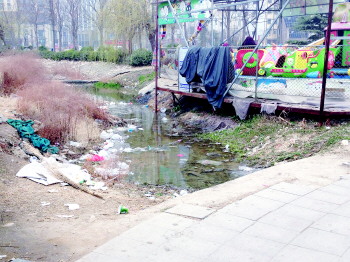 16日早9点多,记者看到,在供销路东侧的一条东西路上,地面残留着大片污渍,道路前方的一条小河边,垃圾遍地,水质浑浊,水面上漂浮着大面积的白色塑料袋、饭盒、竹签、纸杯、饮料瓶……水里的场景与岸边玩具器械上传来的孩子的笑声格格不入。