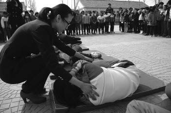 16日,在寒亭区开元街办安固小学,安全员正在教学生如何规避踩踏危险。为了保证学生的安全,学校邀请安全专家到学校里为学生讲解有关防踩踏的知识,让学生保护好自己,防止意外发生。