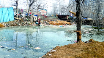 ▼被铁皮围住的垃圾坑。
