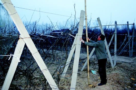 据了解,打渔张森林公园北面的梨园一共有6户承包,记者16日看到的竖立着粘网的是其中3户,其余3户的网已在去年冬天摘除。梨园里所种植的黄金梨在国庆节期间成熟,因为之前有鸟类会在梨成熟期间来啄食,果农竖起粘网是不得已而为之。“网是在2014年国庆节之前围起来的,目的就是为了防止鸟儿吃梨,你看一些鸟的尸体都已经只剩下骨架了,因此可以断定不是非法捕鸟来食用的。”滨州市林业局一位执法人员告诉记者,去年黄金梨成熟之后,已有3户摘除了粘网,还剩3户没摘。