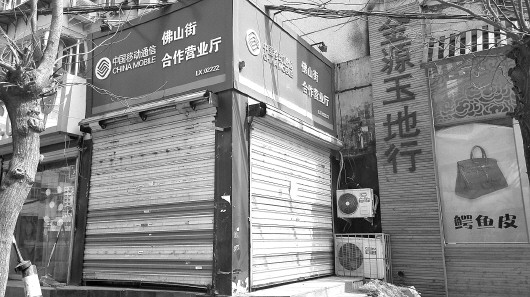 佛山街上的棋盘小区6区13号楼下,汇集了美甲店、饭店、理发店、话费充值点以及各种和生活息息相关的店铺,而这里最小的店铺一年房租都在3万元以上。和其他正常营业的店面相比,一家挂着崭新的“中国移动通信佛山街合作营业厅”广告牌的话费充值点,因为每天来这里充话费的人越来越少,店已经关门了两个月。“每天只有几个人充话费,生意差得很。”旁边包子铺的老板说,因为付不起房租,这家店最后不得不关了门。