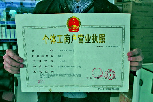 2014年1月,崔先生接手了赵先生位于张庄路315-3号的好幸福商行,开了一家某品牌化妆品店,并先沿用了赵先生2012年10月办理的营业执照。“总部要求如果连续两个月不交税就不供货,那根本没法做生意了。但是税务登记和营业执照上的名字要一致,我必须重新办理一张我自己名字的营业执照。”