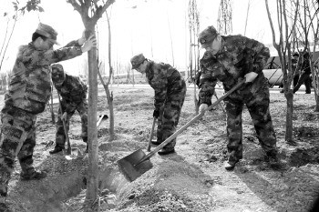 近日,济宁军分区组织驻军和民兵预备役人员广泛开展植树造林活动,为创建文明卫生生态城市做贡献。图为军分区领导带头植树造林。