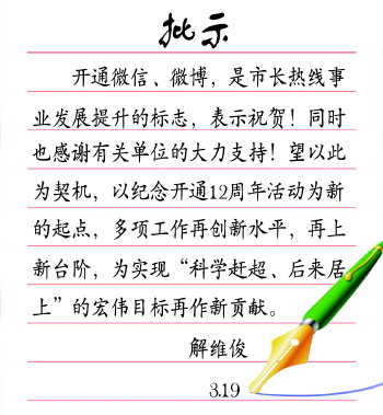 当天,菏泽市委副书记、市长解维俊还对菏泽市长热线的工作报告作了批示,希望以纪念开通12周年活动为新的起点,市长热线多项工作再创新水平,再上新台阶,为实现“科学赶超、后来居上”的宏伟目标再作新贡献。