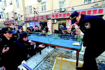 19日,市南城管执法局与市南公安组成33人联合执法队伍,对火车站周边饭店占路经营行为进行了综合整治。当日上午9点,在湖南路68号,执法人员发现,一家临街饭店在人行道上堆放了多个玻璃鱼缸,鱼缸还用防水布盖了起来。随后,执法人员依法将鱼缸暂扣并运走。记者注意到,周边的几家饭店看到城管执法,立即让员工捞出鱼缸里的海鲜,赶紧将鱼缸搬走。一家饭店业主称,看到旁边饭店把鱼缸摆到人行道上,觉得不摆会吃亏,所以也跟风占路。