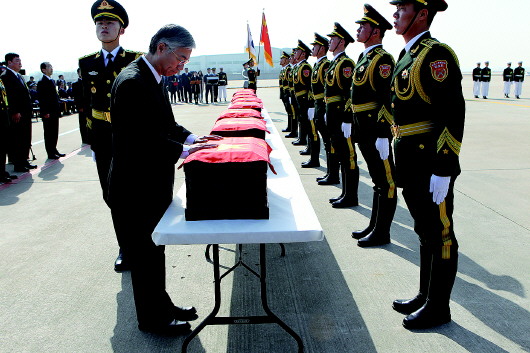 20日,在韩国仁川机场,中国驻韩大使邱国洪(前左)为志愿军烈士遗骸棺椁覆盖国旗。 新华社发