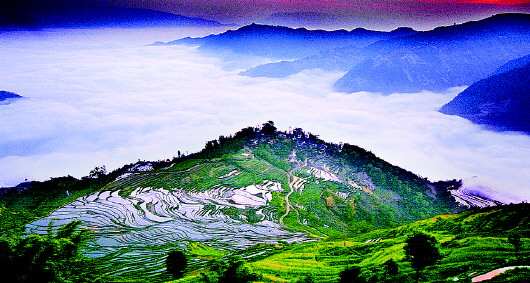 这是往往被我们忽视的一个景色,却往往在摄影师的眼中成为一幅幅美丽的油墨画作。梯田,农民劳作的结果,在初春,特别是南方的初春,辛勤的农民们已经在田间地头播撒下绿色的禾苗,整片梯田开始焕发生机,在晨雾朦胧之际,那种美,绿色、黄色、红色、蓝色,大片大片的色块,被雾气折射,像一道人间的彩虹,既朦胧又夺目。