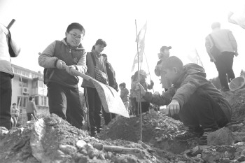 22日上午,本报组织第二期植树活动,300余名志愿者种下千余棵树。小朋友在大人的帮助下也忙活得有模有样。