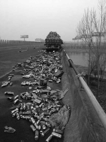 大火被扑灭后,路上留下大量罐装啤酒。