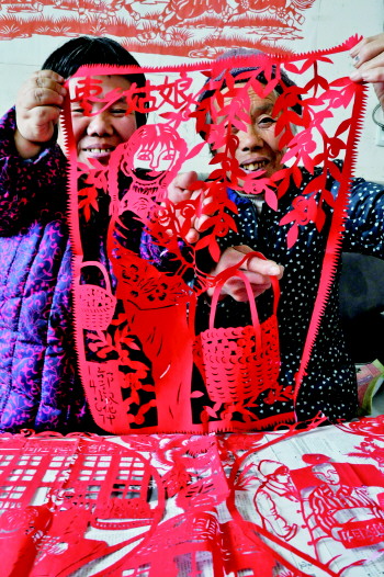 郭淑华(左)的剪纸作品《枣乡姑娘》。 本报记者 郭庆文 摄