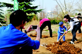 孩子种树家长忙拍照,留下精彩瞬间。 本报记者 刘涛 摄