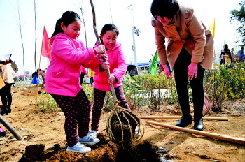 植树开始了,很多家庭都是四五口人全部出动,而孩子们都显得特别高兴。有的孩子都不让家长帮忙,要自己挖坑种树,不高的个子抱着长长的工具显得特别有意思。干净的衣服一会弄得脏兮兮。不少家长也乐在其中,站在一边看着自己的孩子辛勤劳作。