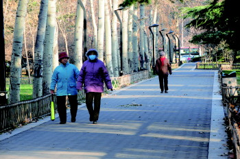 ◤市民在公园散步,经常锻炼可增强身体抵抗力(资料片)。 本报记者 姜文洁 摄