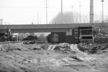 3月24日,在天衢东路下穿京台高速涵洞处,京台高速的桥面建设已经完成,施工人员正在忙着开挖下穿路面,贯通天衢东路指日可待。      本报记者 马志勇 摄