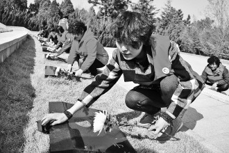25日,在市烈士陵园,西北村、海城社区志愿者前往烈士陵园扫墓,缅怀烈士。