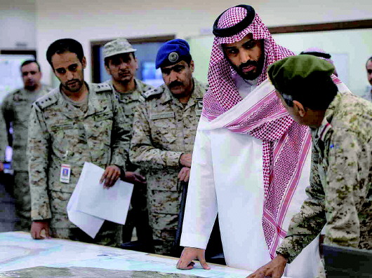 ◤25日,沙特国防大臣萨勒曼(右二)在位于沙特南部和也门接壤的战斗指挥中心听取汇报。 新华/沙通社