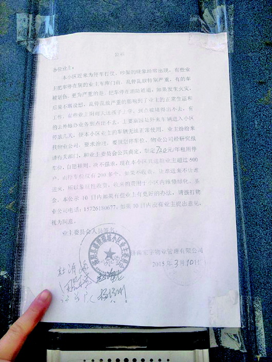 24日上午9时30分许,记者来到盛世瑞城小区,发现每个单元门上贴有一张关于收取停车位费用的通知,上面写着本小区进驻业主超过500户,而停车位仅有200余个,为方便管理,物业提出租用停车位方案,每年缴纳720元。
