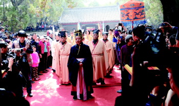 21日(农历二月二日),邹城举办祭祀孟子大典。在大束镇孟子林景区恢复举办的传统的祭孟大典,活动引来八方游客。图为祭祀现场。   本报通讯员 张现伟 薛彬 摄